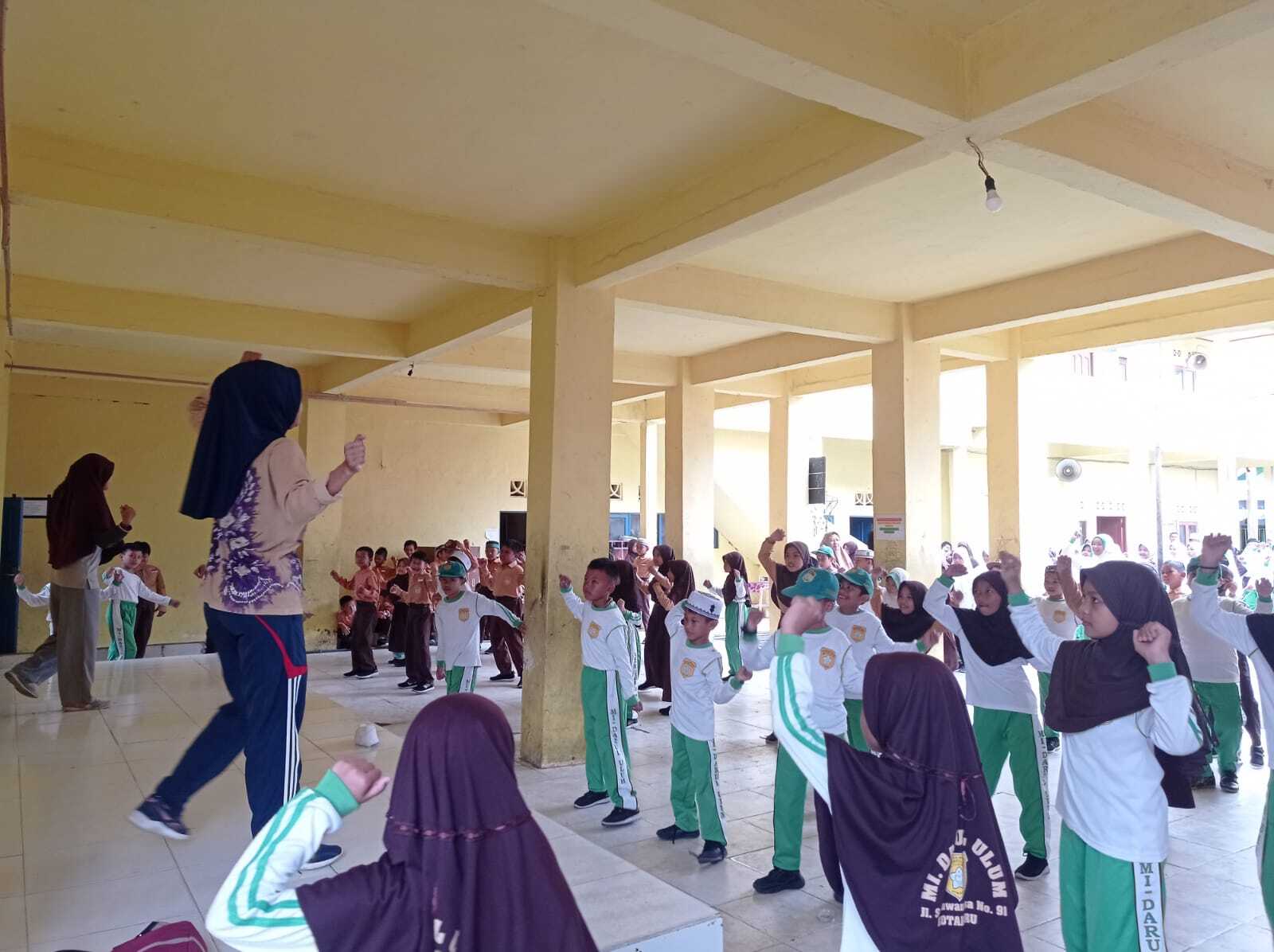 MIS Darul Ulum Kotabaru>>> Jum’at, 10 Februari 2023, seluruh peserta didik dan guru MIS Darul Ulum Kotabaru laksanakan kegiatan rutin senam sabtu pagi di halaman madrasah yang dimulai pada pukul 07.30 WITA. Senam pagi merupakan suatu aktifitas fisik yang perlu diadakan untuk menjaga kebugaran jasmani para peserta didik. Gerakan-gerakan senam pagi bermanfaat untuk melatih otot-otot pada tubuh, melancarkan peredaran darah sehingga lebih sehat dan segar. Paparan sinar matahari pagi juga bagus bagi tubuh karena kandungan vitamin D alaminya. Jika tubuh sehat dan bugar secara fisik, maka kemampuan konsentrasi juga akan meningkat.